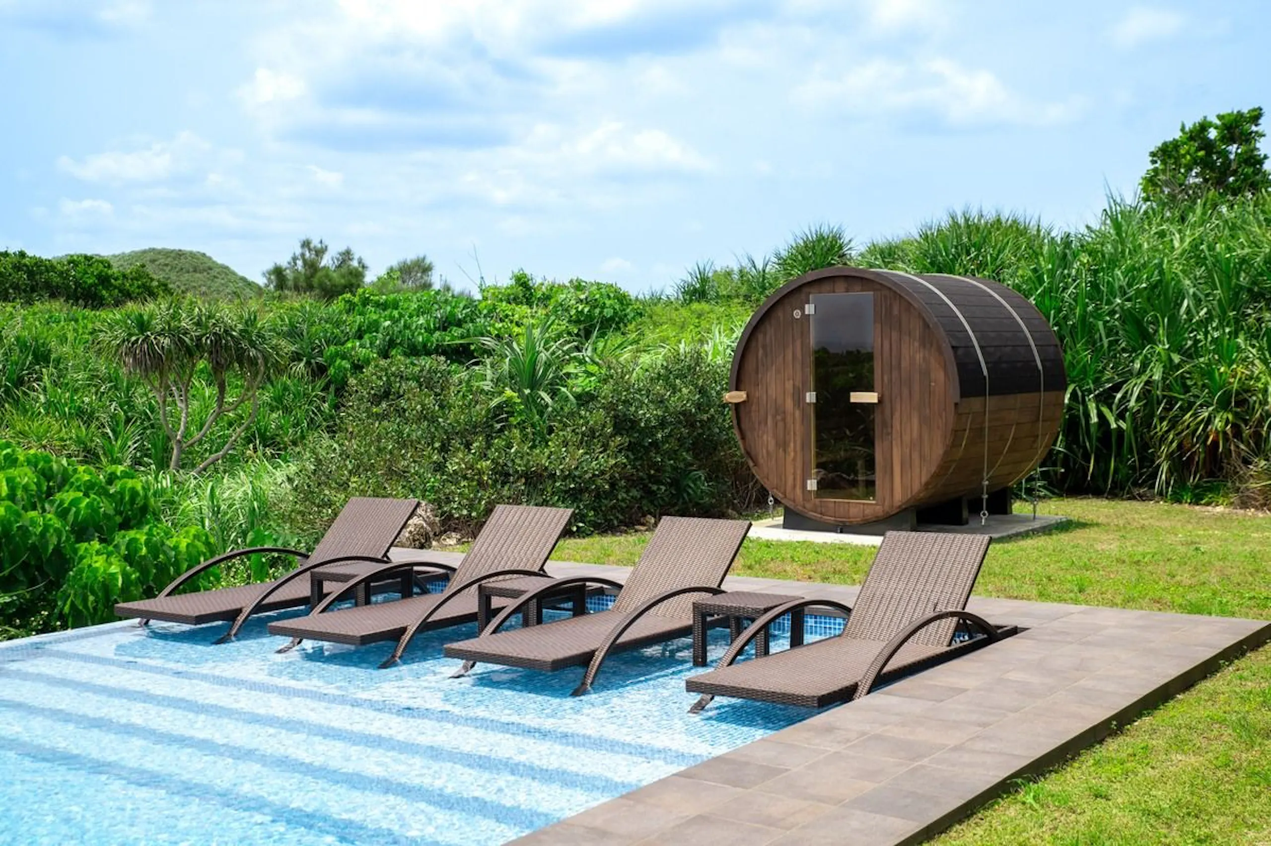 ヴィラには、海を一望できるインフィニティプールがあり、まるで海と一体になったような開放感を味わえます。また、プールの他にも屋内外にあるジャグジー、バレルサウナなど豪華な設備が充実。
