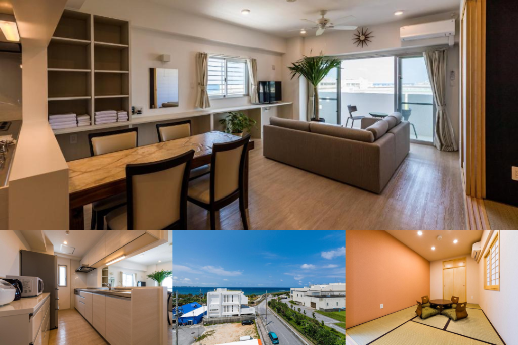 | MINATO Chatan Seaside Condominium | 31,904円~ | ・2019年にできたばかりの新築コンドミニアム ・1フロアに1客室 ・畳スペース完備 | 7名 | 那覇空港から車で約35分 | 無料 1室2台まで可 予約不要 | |||