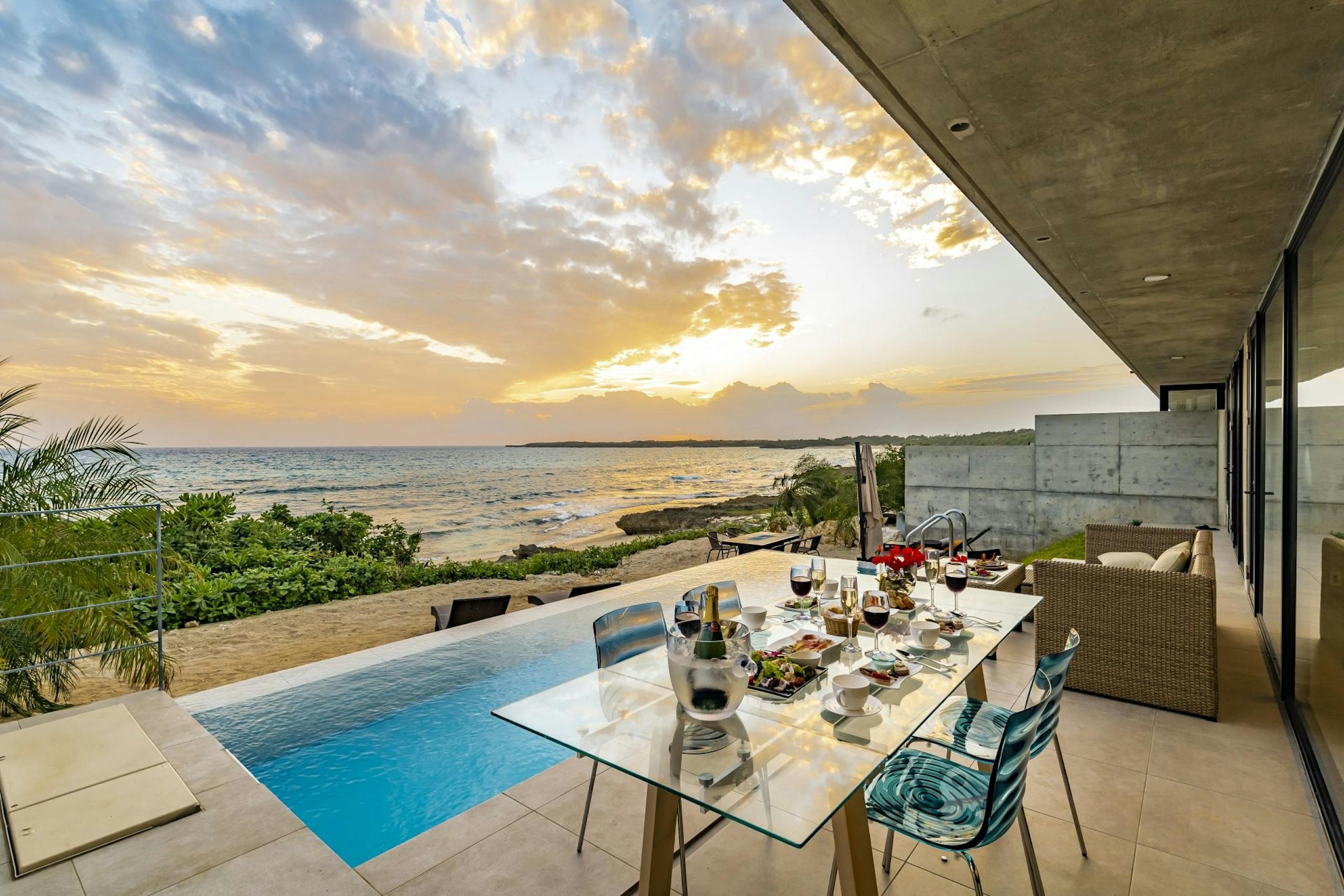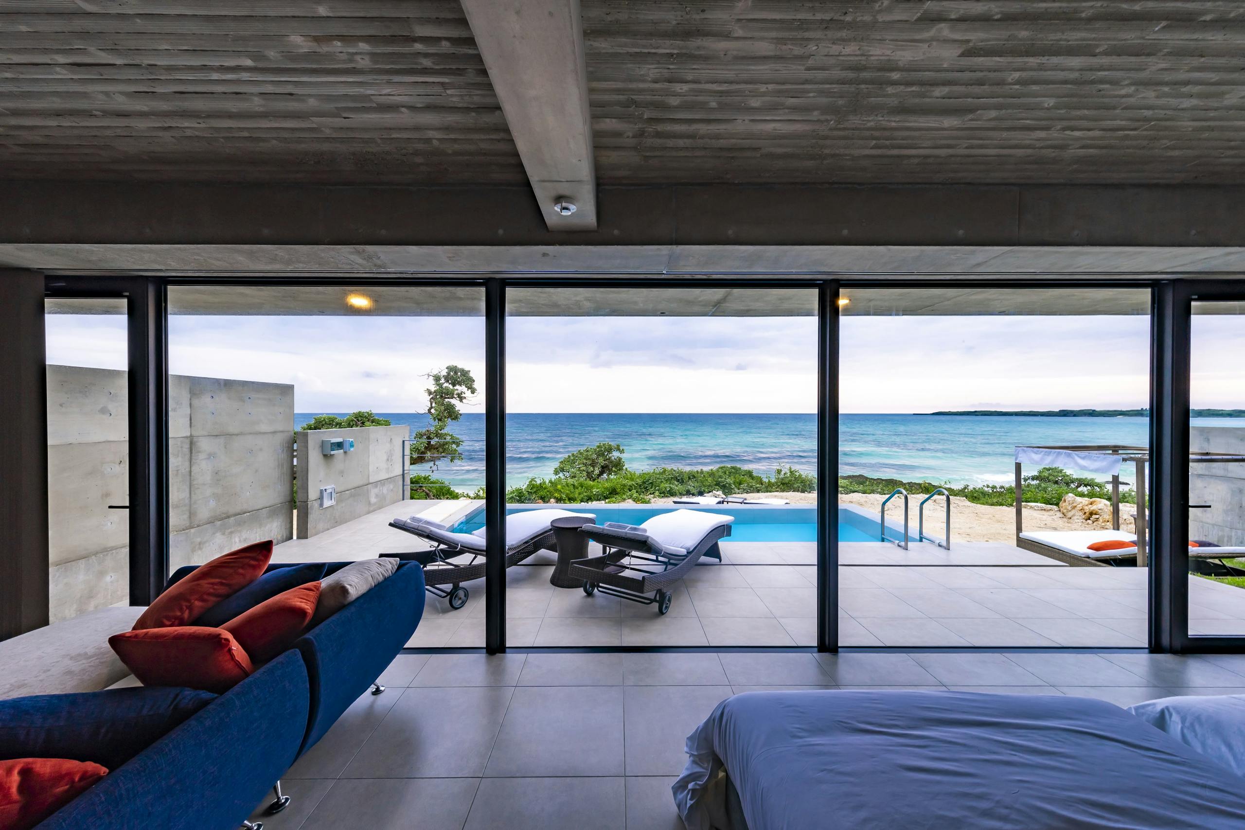 1日1組限定の完全プライベートヴィラで、リビングの大きな窓からは東シナ海の水平線が広がり、プライベートプールからはサンセットと満天の星空を楽しめます。