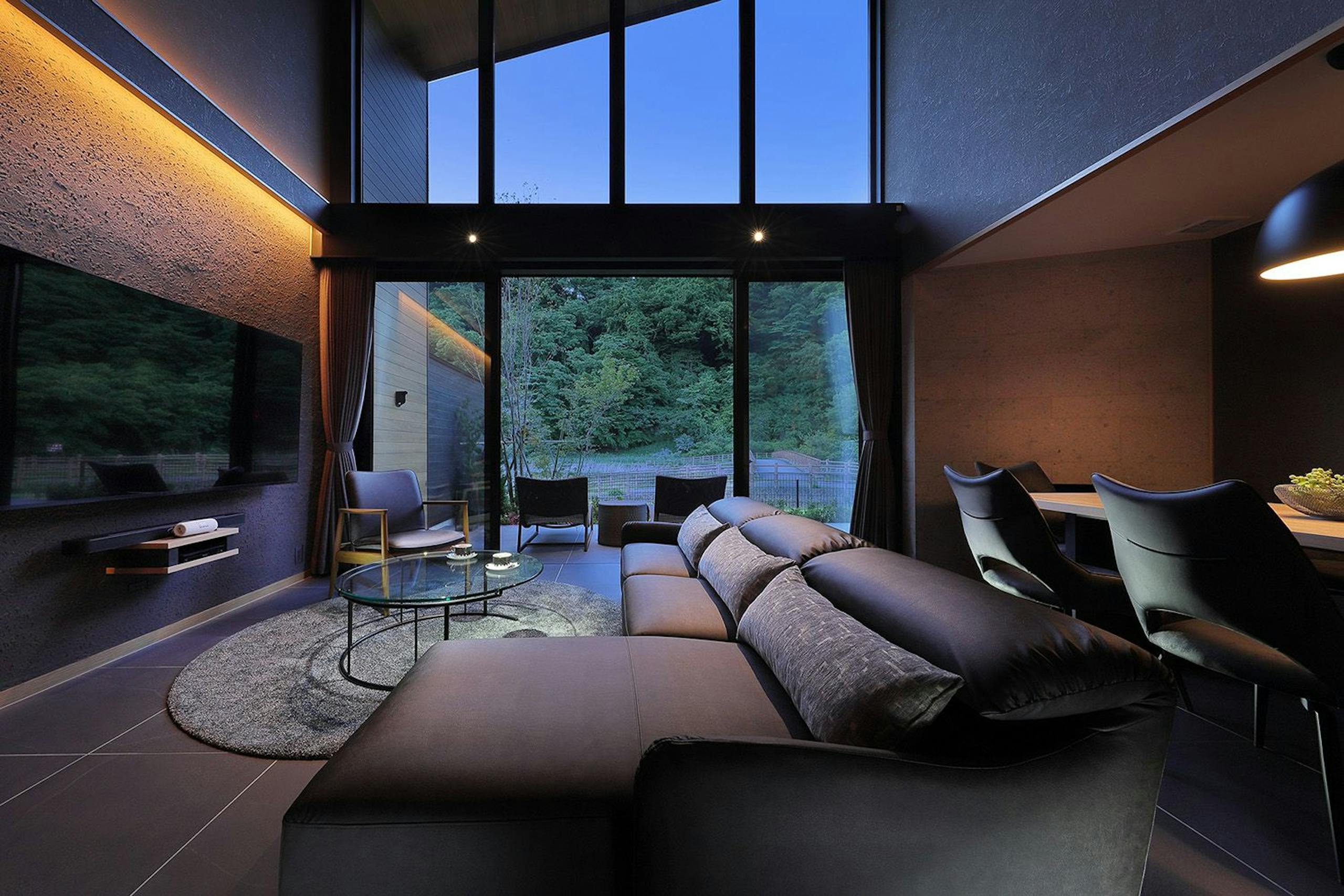 露天風呂付きヴィラ「紅葉(くれは)」は、栃木県の塩原温泉にある1日4組限定の完全プライベートヴィラ。ヴィラはメゾネット仕様で、200㎡の広さを誇り、モダン和風のインテリアが施され、解放感のある吹き抜けのリビングからは、四季折々の美しい山の景色を堪能。