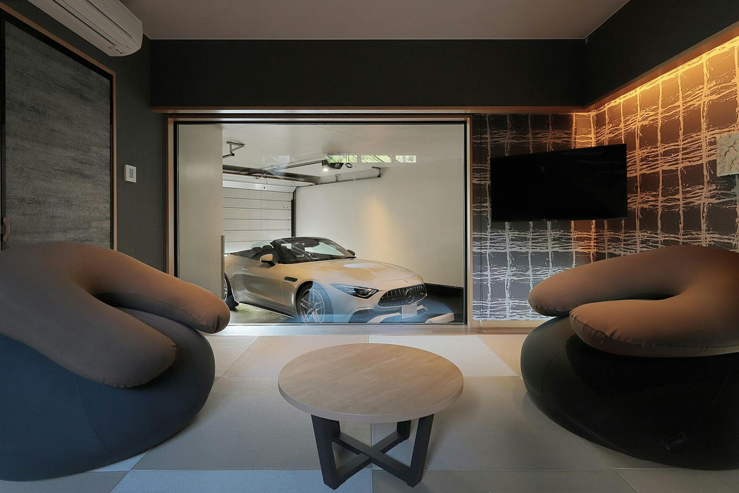 各ヴィラには専用の源泉かけ流しの半露天風呂があり、2階にはプライベート岩盤浴も完備。また、車好きにはたまらない、愛車を眺めることができる専用ガレージ付きで、リビングからガラス越しに愛車をショールームのように眺めることができます。